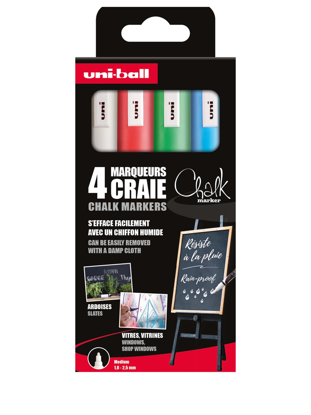 ETUI 4 MARQUEURS CRAIE UNI- BALL – CHALKMARKER – BLANC ROUGE VERT BLEU – 1.8-2.5MM